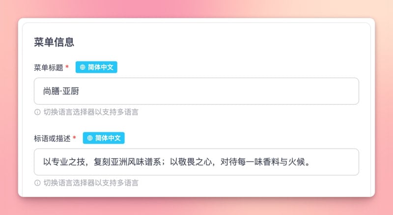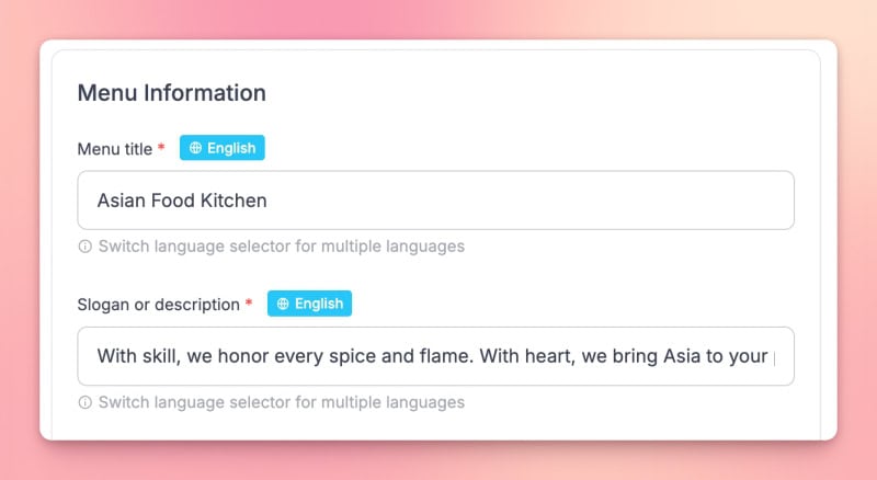 Business name and short description can be translated per language.