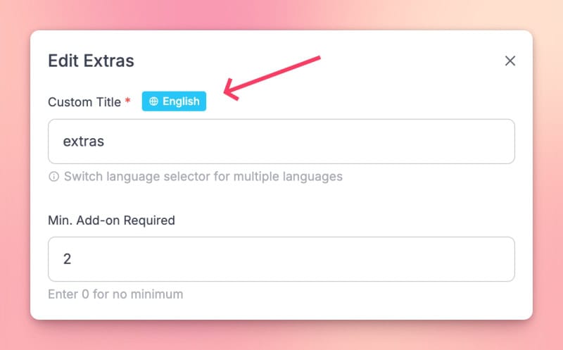 The custom title for item extras (e.g. "Add-ons", "Toppings") can be translated per language.