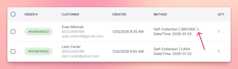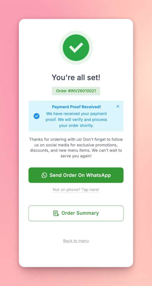 For QR code payments, customers can upload a screenshot or photo of their payment proof on the same payscreen where they see the QR code.